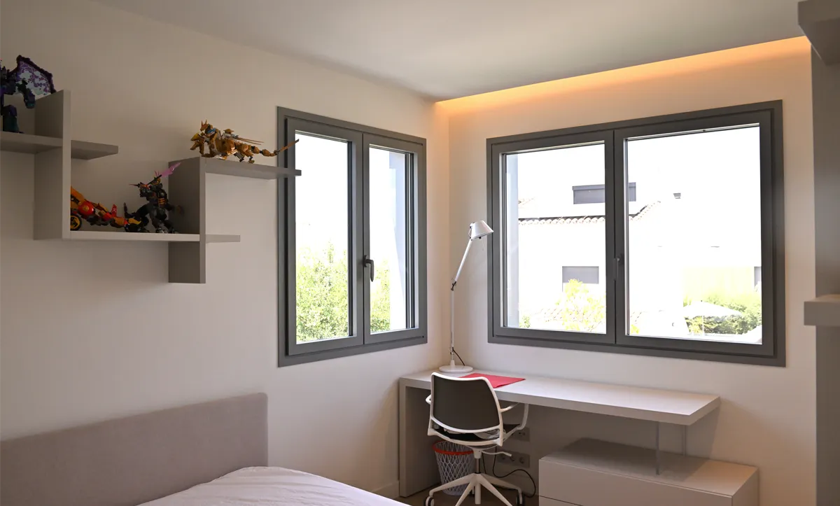 - Finestres de gran format amb perfileria d’alumini de color gris fosc, dissenyades per maximitzar l’entrada de llum natural i oferir una visió panoràmica de l’exterior.