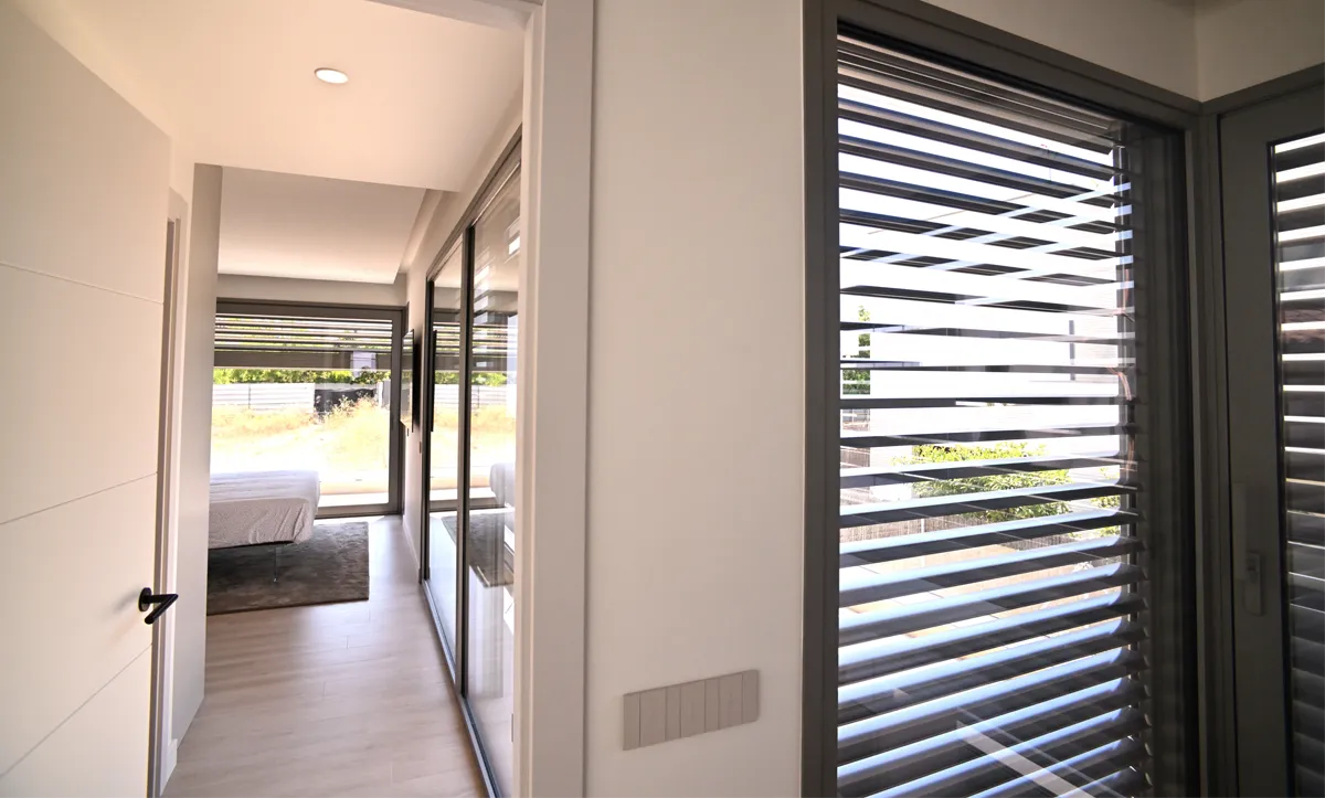 - Persianes d’alumini biselades i motoritzades, que ofereixen una combinació perfecta de comoditat, control solar automàtic i seguretat, mantenint una línia estètica contemporània i neta.