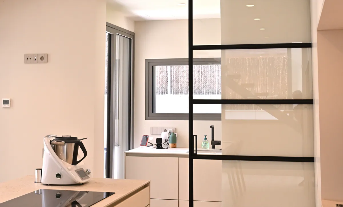 Per dividir amb discreció i estil dos ambients de la zona de dia, hem instal·lat una porta corredissa de vidre amb perfil d’alumini, que permet separar la cuina del menjador sense renunciar a la sensació d’obertura. Un sistema suau, pràctic i de línies minimalistes que aporta lleugeresa i modernitat.