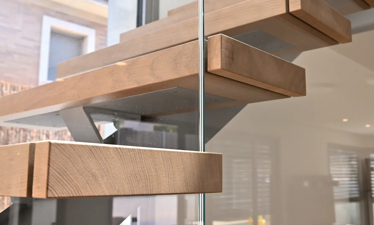 - Esglaons de fusta flotants, fixats de forma invisible per potenciar l’efecte suspès.