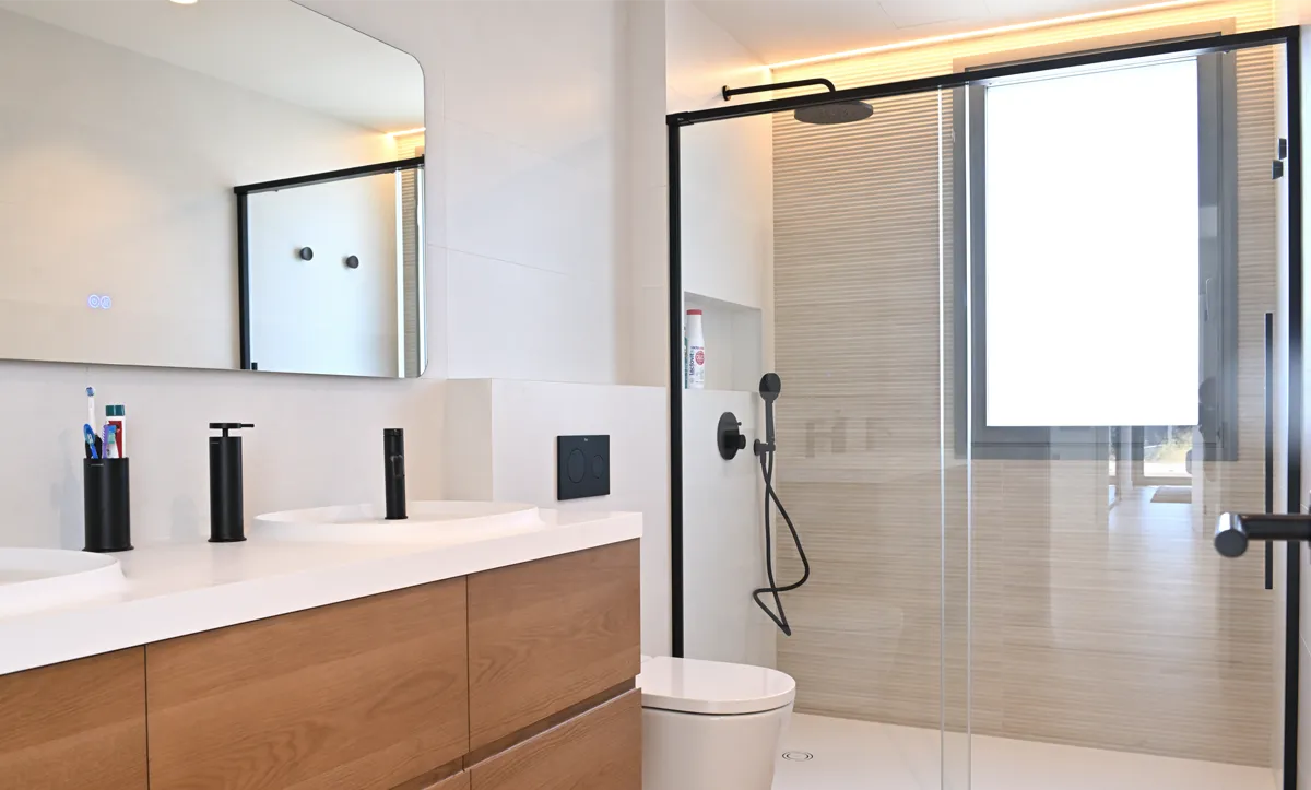 Per al bany principal, s’ha instal·lat una mampara de vidre a mida per a una dutxa de gran format. El sistema compta amb:
